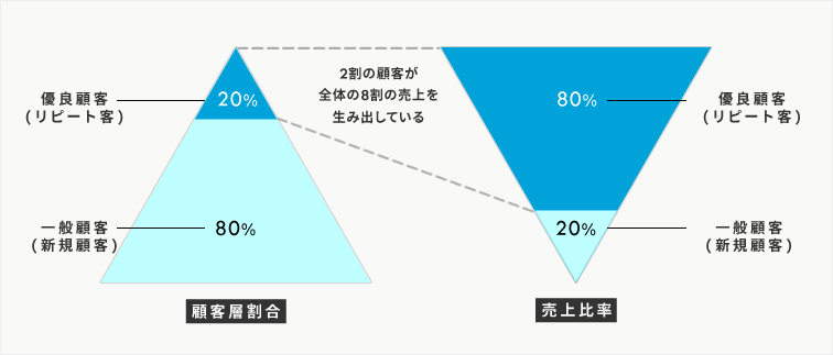 しかし、驚くべき事実ですが、店舗の売上の80%はリピート客が生み出していると言われており、新規顧客が生み出す売上の4倍以上を占めているのです(下図参考)。ですので本来は、集客コストは新規顧客よりピート客に多く割かれるべきなのです。