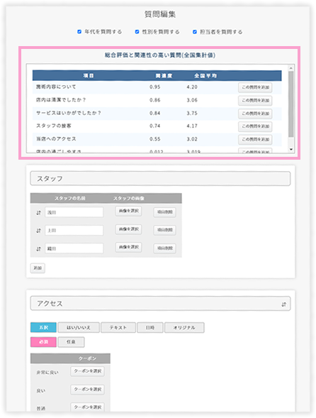 また右のアンケート作成画面の画像の上部(ピンクの枠内)にある、「総合評価と関連性の高い質問」では総合評価と各質問の関連度と同様の質問をしている他店舗の全国平均スコアが分かり、ワンクリックでその質問をご自身のアンケート質問に追加することができます。