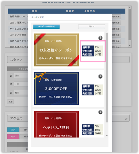 また、各クーポンの「使用率」「使用回数」「発行回数」も表示されるので各クーポンの精査をすることができます。(右のピンクの枠内参照)※クーポンの重複について