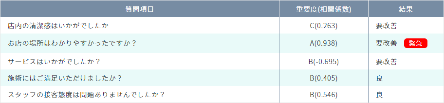 例えば、「施術内容はどうでしたか?」という質問が総合評価に非常に関連性が高く(重要性が高く)、更にその評価が5.0点中2.5点しかなかった場合などに、緊急アラートがでます。
