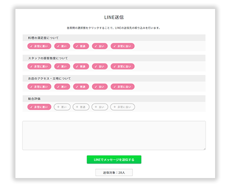 (例)「価格には満足しましたか?」という質問に「非常に悪い」と答えた顧客のLINEリストを簡単に取得することができ、そのままそのリストにLINEで一斉送信をすることもできます。 -
